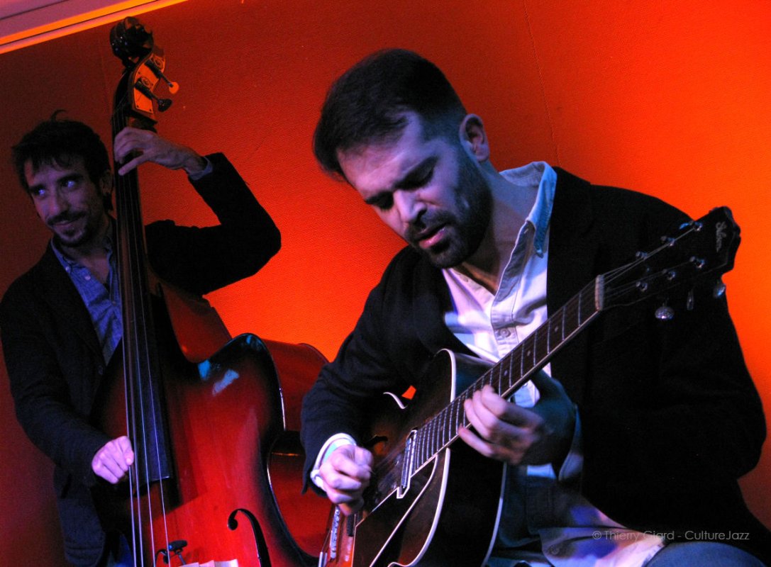 La formule du trio sans batterie impose une grande cohésion de la formation. Le rythme et l’harmonie, éléments clés de ces courants du jazz, supposent que chacun assure le tempo sans faillir. Bien épaulé par le contrebassiste italien Kim Baiunco, un habitué des nuits swing parisiennes, Clément Trimouille développe un jeu de guitare varié et inventif, autant dans ses phrases mélodiques toujours inspirées que dans son soutien rythmique qui combine différentes influences distillées à bon escient, de la guitare jazz à la Wes Montgomery jusqu’à quelques ficelles du jazz manouche (la fameuse pompe !). Tout au long du concert en deux sets gagnants, on a pu apprécier la complicité joueuse des trois instrumentistes.